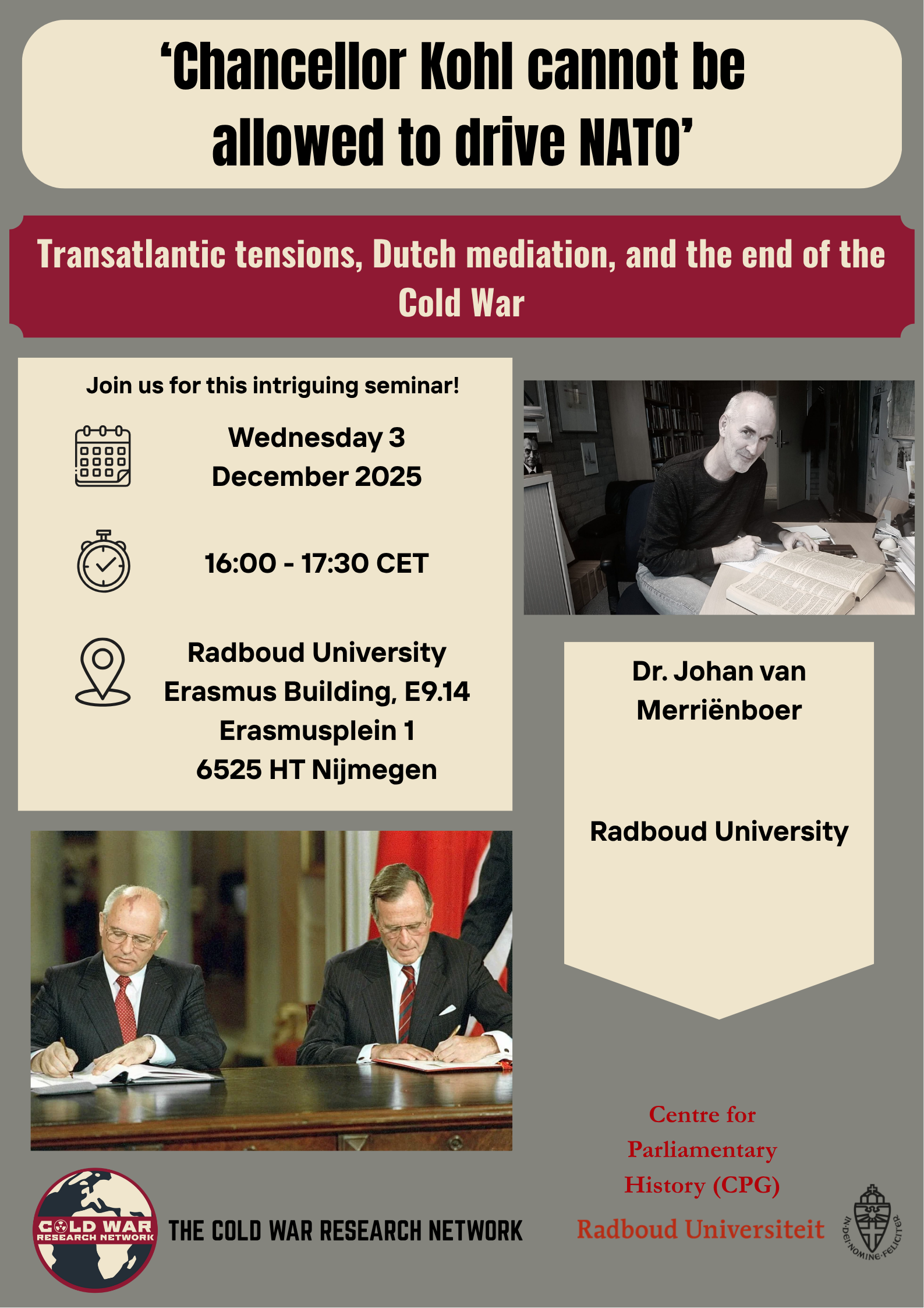 In this lecture, Dr. Van Merriënboer will discuss Lubbers’s behind-the-scenes diplomacy in the spring of 1989, when tensions within NATO over the modernization of short-range nuclear weapons coincided with shifting Western attitudes toward Mikhail Gorbachev’s reform policies and the Soviet leader’s growing popularity, especially in the Federal Republic of Germany under Chancellor Helmut Kohl (1982 – 1998). Drawing on archival research and Lubbers’s memoirs, the talk will highlight how the Dutch Prime Minister positioned the Netherlands as a mediator between the United States and West Germany, contributing to the formulation of a new American strategy for Europe and the Soviet Union. In this way, Dutch diplomacy played a significant part in creating the favourable political climate, the so-called ‘Wind of Change,’ that paved the way for the peaceful end of the Cold War.