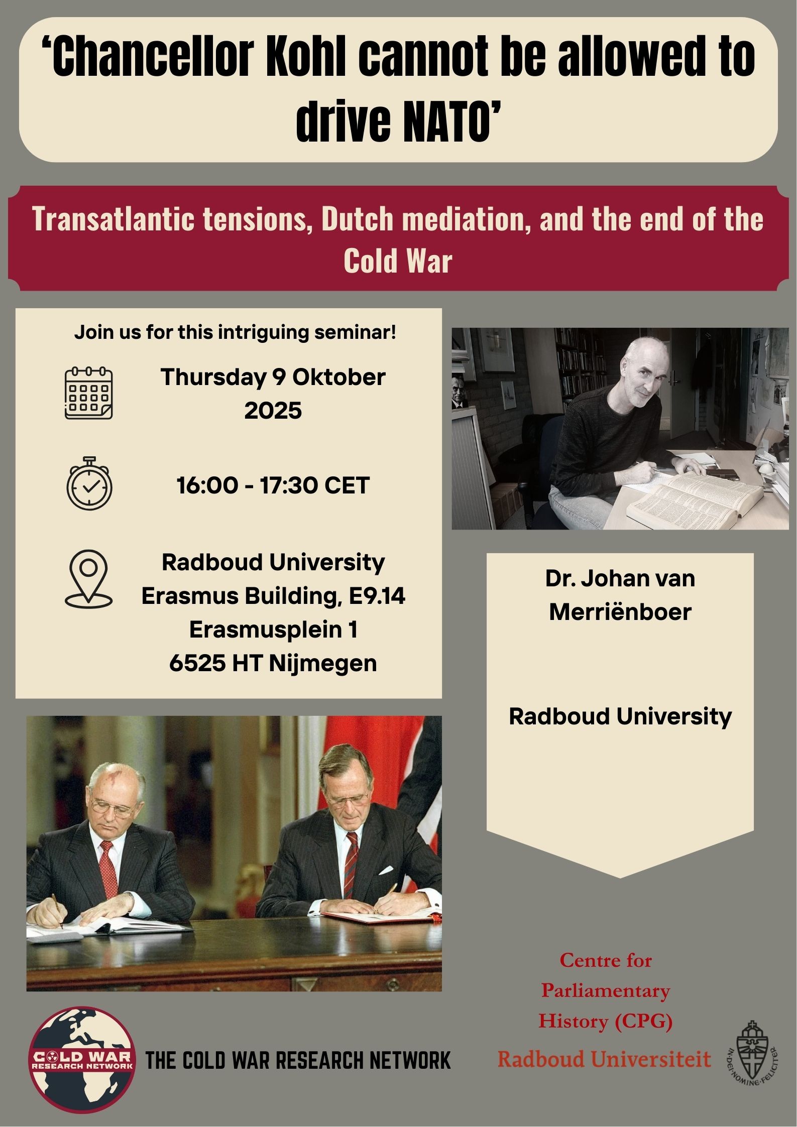 In this lecture, dr. Van Merriënboer will discuss Lubbers’s behind-the-scenes diplomacy in the spring of 1989, when tensions within NATO over the modernization of short-range nuclear weapons coincided with shifting Western attitudes toward Mikhail Gorbachev’s reform policies and the Soviet leader’s growing popularity, especially in the Federal Republic of Germany under Chancellor Helmut Kohl (1982 – 1998). Drawing on archival research and Lubbers’s memoirs, the talk will highlight how the Dutch Prime Minister positioned the Netherlands as a mediator between the United States and West Germany, contributing to the formulation of a new American strategy for Europe and the Soviet Union. In this way, Dutch diplomacy played a significant part in creating the favourable political climate, the so-called ‘Wind of Change,’ that paved the way for the peaceful end of the Cold War.