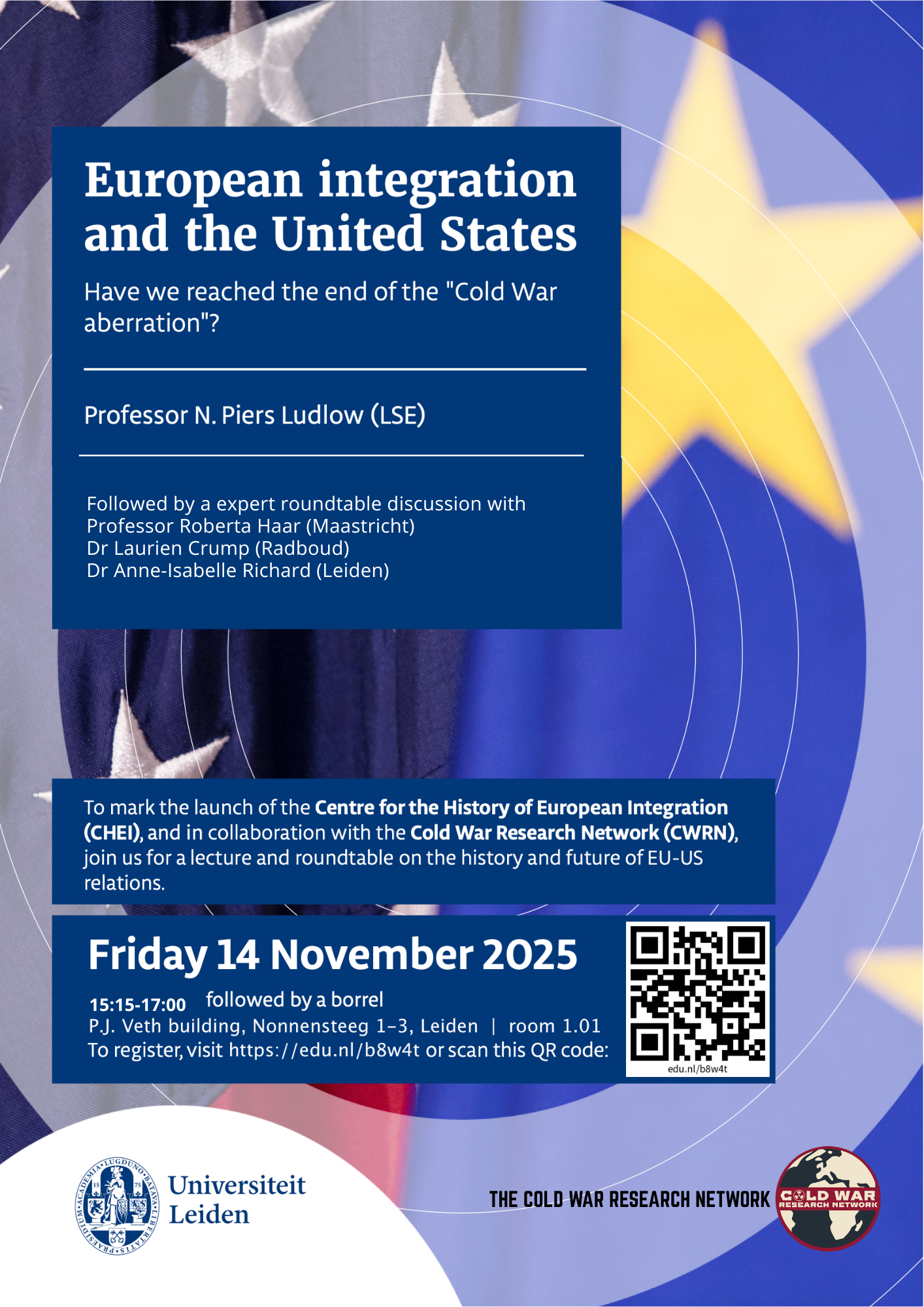 The event is organized by Dr. Matthew Broad on behalf of the Centre for the History of European Integration (CHEI) and held with the kind support of Leiden University’s Europe Hub and the Institute for History’s and International Studies team.